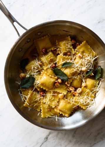 There's something so comforting in the simplicity of pasta with sage and brown butter. This recipe kicks it up a notch by adding hazelnuts for crunch, and is then served on top of al dente ravioli or whatever pasta you have on hand.
