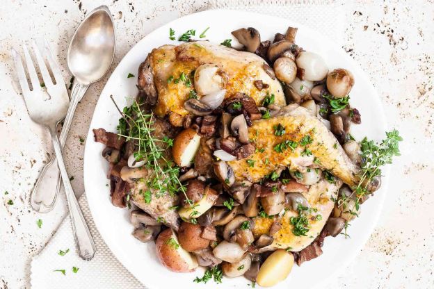 Don't be intimidated by its fancy French name. Coq au vin is simply a dish of braised chicken  in red wine with onions, mushrooms and bacon (and utterly delish!). It's basically the poultry sister to beef bourguignon. Get the recipe here.