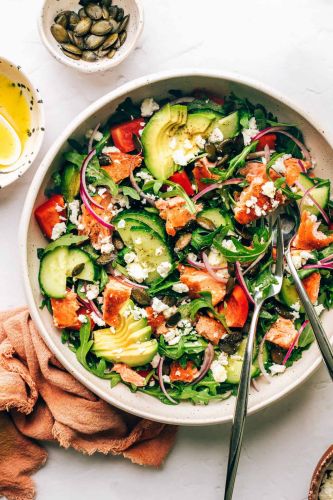 This healthy, refreshing salmon salad is filled with tangy feta, rich avocado, crispy cucumber and more, and it can be on the table in less than 30 minutes. All you have to do is cook the salmon first, then assemble and toss it with a simple dressing. Get the recipe here.