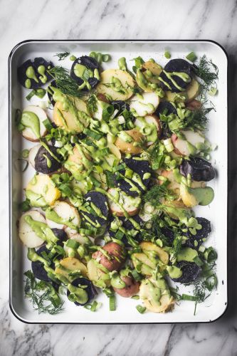 This vegan potato salad does not compromise on flavor. Using a "creamy" herbed tahini sauce, this recipe is a great addition to any barbecue menu. The herbs will refresh your palate, and tahini lends a hint of tanginess.