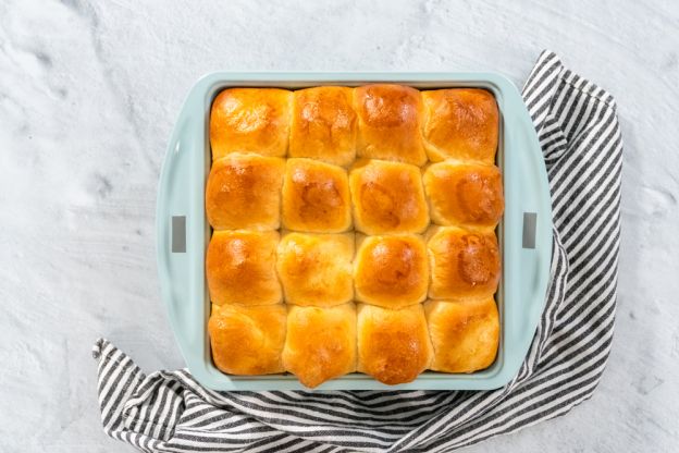 - Cover the casserole dish with a damp cloth or plastic wrap and let the rolls rise in a warm place for about 30 min. or until doubled in size.