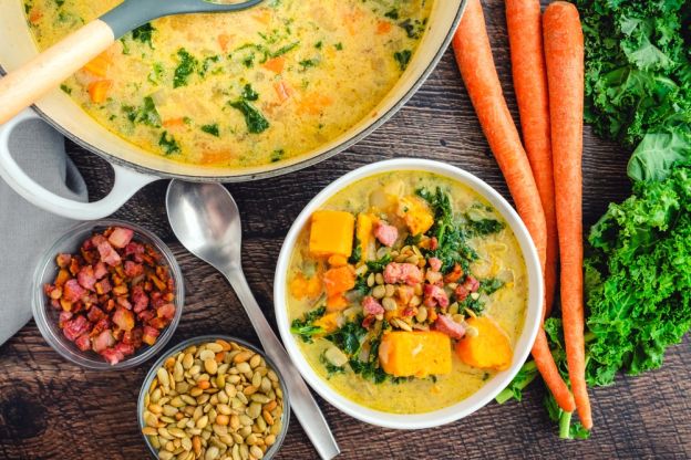 Use an immersion blender to blend the soup until smooth and creamy. (Alternatively, you can transfer the soup in batches to a blender.) Stir in the heavy cream, chopped kale or spinach, thyme, and smoked paprika. Cook for another 5 min. until the greens are wilted and the chowder is heated through.