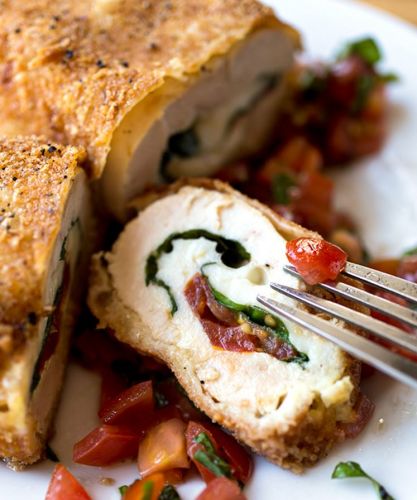 Marinated and breaded chicken breast stuffed with mozzarella, basil and marinated tomatoes = Caprese bliss. The classic Italian dish is transformed into a stuffed chicken dish that's sure to please with its simple, yet delicious flavors. Get the recipe here.