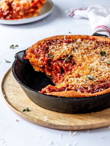 This homemade version of one of Chicago's most famous dishes is baked in a cast iron skillet and features a thick, buttery crust that’s perfectly crispy and baked to golden perfection. Layered with gooey mozzarella cheese, your favorite toppings, this pizza is a hearty and satisfying meal. Perfect for a cozy night in, it brings the classic flavors of Chicago-style deep dish right to your kitchen!