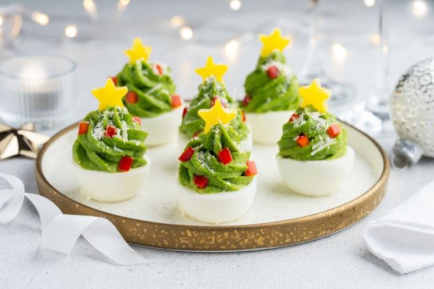- Arrange the deviled eggs in the shape of a tree on the platter. You can line them up in a triangular shape or layer them for a more dimensional look.