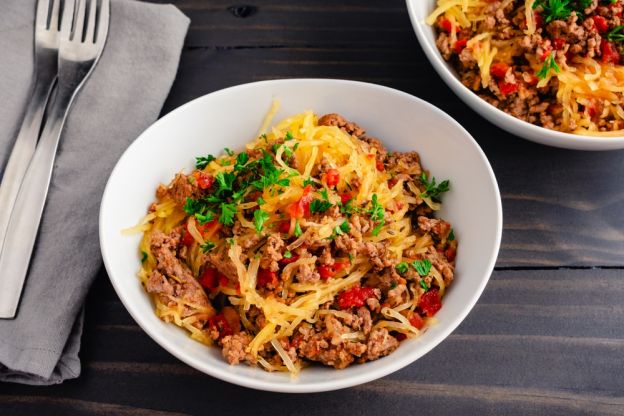 Once the squash is done, use a fork to scrape the flesh into spaghetti-like strands. Divide the strands between plates or bowls and top with the turkey bolognese sauce.