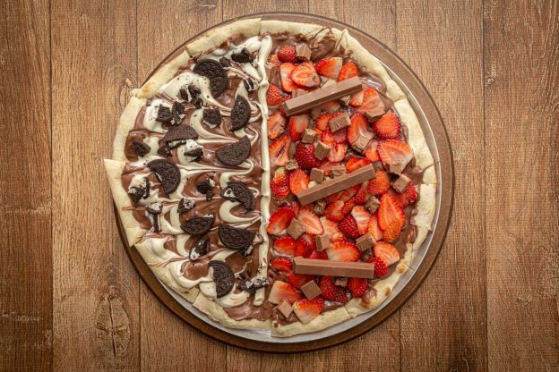 If you're a fan of all things sweet, this dessert pizza will be a game-changer. On one half, you've got a decadent Nutella-white chocolate sauce topped with Oreos, and on the other, Nutella topped with fresh strawberries and Kit Kat bars. Need we say more?