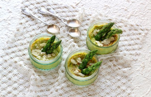 Simply blanche or steam a bunch of asparagus until soft. Then blend in a food processor along with 1 clove of garlic, 2 tablespoons of sour or heavy cream, 1/2 cup of grated Parmesan and 1 egg. Season with salt and pepper to taste, then add the puree to glass ramekins and bake for 15 minutes or until the flans are set. Garnish with Parmesan flakes and asparagus tips.