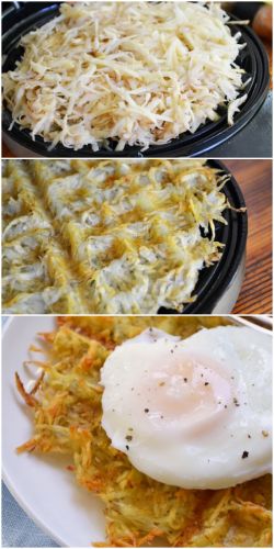 Grate some potatoes, flatten them in a dish towel and season. Add eggs and flour, then cook 'em up in your waffle-iron for perfectly crunchy hash browns.