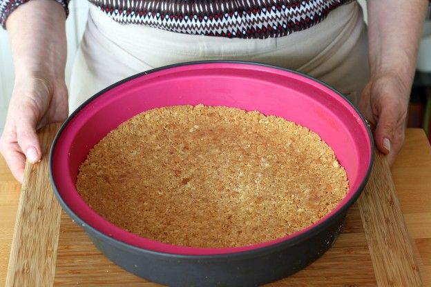 While pressing down, make sure that the edges of the crust lightly turn upwards. Don't make it overly compact, otherwise the crust will become too hard. Refrigerate for at least 2 hours, or until the crust has hardened.