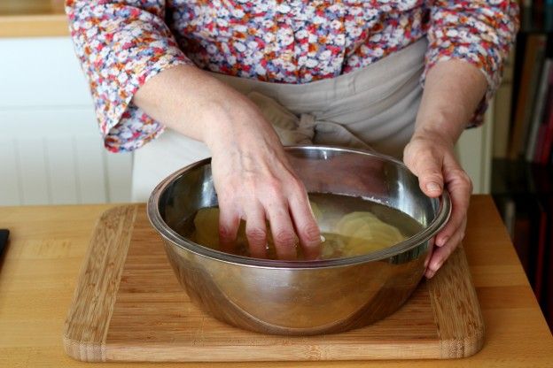 Fill the bowl with cold water, then rinse the potatoes with more running tap water. They're ready when the water is clear and no longer white.