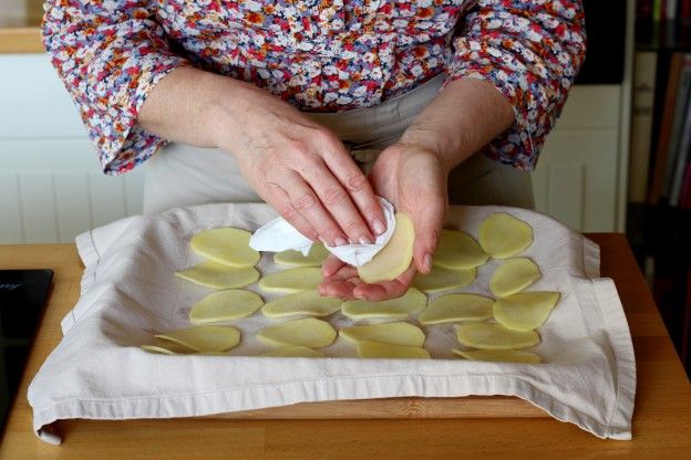 Dry each potato slice once more using a paper towel. The key to crispy, golden potato chips is getting them really dry at this stage.