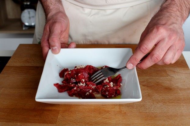 Marinate the meat at room temperature for 30 minutes with the grated garlic, fish sauce, sugar and oil.