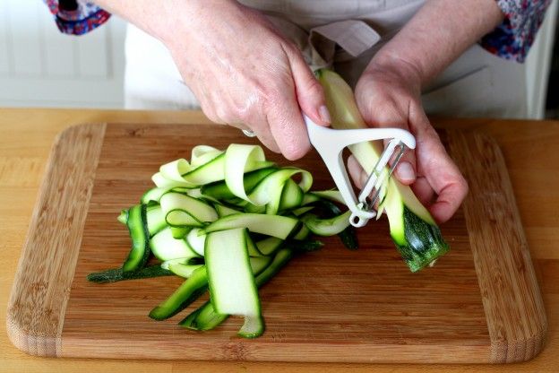 Wash the zucchini, then shave it into long, thin ribbons using a vegetable peeler or a paring knife. As soon as you get to the seeds, rotate the zucchini 90° and continue paring it down.