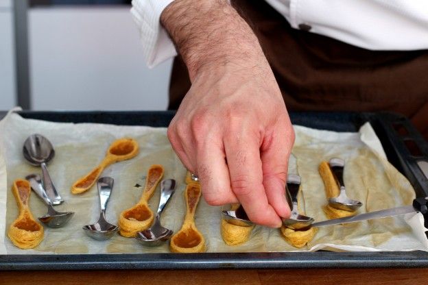 When the "spoons" are golden brown, take them out of the oven, then carefully remove the metal spoons from the crust. Place the puff-pastry spoons onto a metal rack to cool.