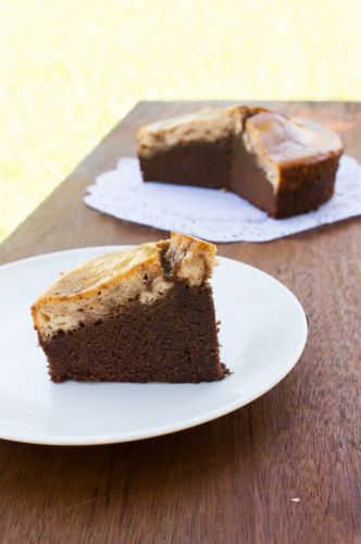 Follow the same steps as the brownie cheesecake swirl, but instead of swirling the two batters together, leave them as they are. Bake and refrigerate until totally chilled before serving.