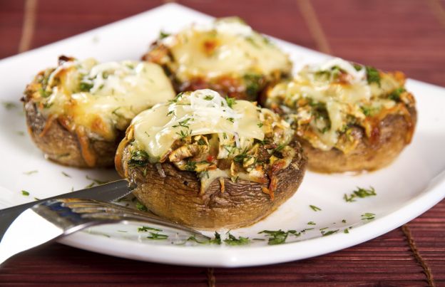 Take 12 mushroom caps and brush them with melted butter. Then saute 1 onion and 1 small shallot in some butter, and deglaze with ½ cup Madeira wine. Remove from heat, then add 3 tablespoons bread crumbs, ¼ cup Swiss cheese and ¼ cup Parmesan, 4 tablespoons minced parsley or tarragon, salt, pepper and 2 tablespoons whipping cream. Mix well to blend, then spoon into the mushroom caps and bake at 375 °F for 15-20 minutes.