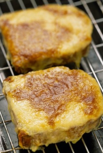 A Welsh Rabbit is the English version of our grilled cheese. Take a slice of toasted bread, top with Cheddar cheese sauce and broil it until the cheese forms a golden brown crust. Serve immediately.