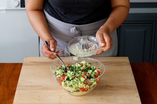 Drizzle the tabbouleh with lemon juice.