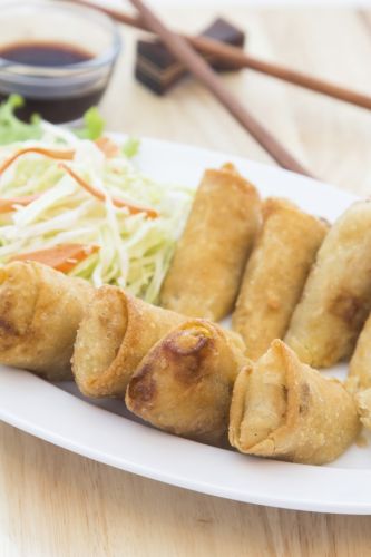 For an Asian appetizer or snack, try these crunchy chicken egg rolls. Combine 1 diced chicken breast, 1 grated carrot and 1/2 cup thinly sliced white button mushrooms in a mixing bowl, and add 1 teaspoon fish sauce and the juice of 1/2 lime. Toss well to coat. Soak rice papers in hot water, add 1 tablespoon stuffing to each, and roll up. Seal the edges with water. Cook in a buttered skillet until golden brown. Serve immediately.