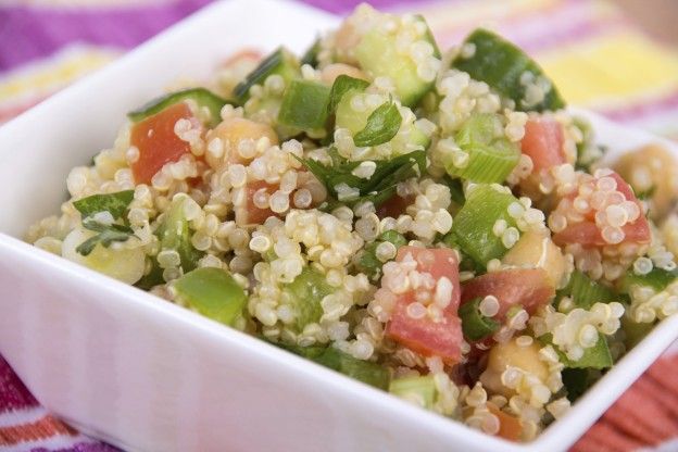 Cook ½ cup quinoa for 15 minutes in a pot of boiling salted water. Once done, rinse under cold water and drain. Transfer to a mixing bowl. Add 2 diced tomatoes, 1/2 diced cucumber and 10 mint leaves roughly chopped. Then add 1 minced shallot, a drizzle of olive oil and a bit of lemon juice. Season to taste and mix well. Serve chilled.