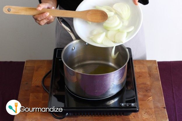 In a large saucepan, soften the onion in olive oil for about 5 minutes.