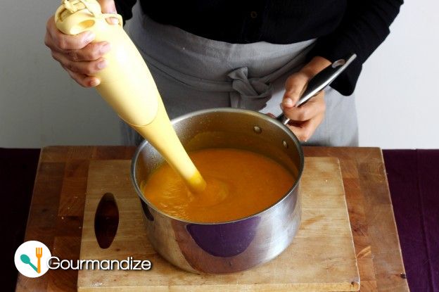 When the soup is cooked, use a hand blender to turn it into a puree, and adjust the seasoning if necessary.