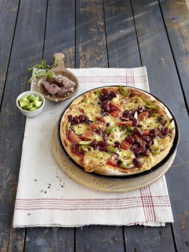 Don't underestimate the appeal of chili on a pizza! Spread your pizza base with tomato sauce, add ground beef, a little sweet pepper and 1 teaspoon five spice seasoning. Add 1 diced tomato and a small can of drained kidney beans. Add 1 bell pepper cut into strips, 1/2 onion, sliced and finish with sliced mozzarella. Bake for 25 minutes at 350 °F.