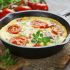 7. Add a slice of salami, a tbsp of pizza sauce, and one raw egg to each ramekin