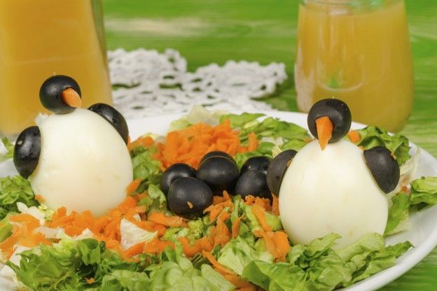 Use toothpicks to hold an olive 'head' and 'flippers' on each egg and decorate as pictured, by using a small piece of grated carrot for the beak. Your kids will love these!
