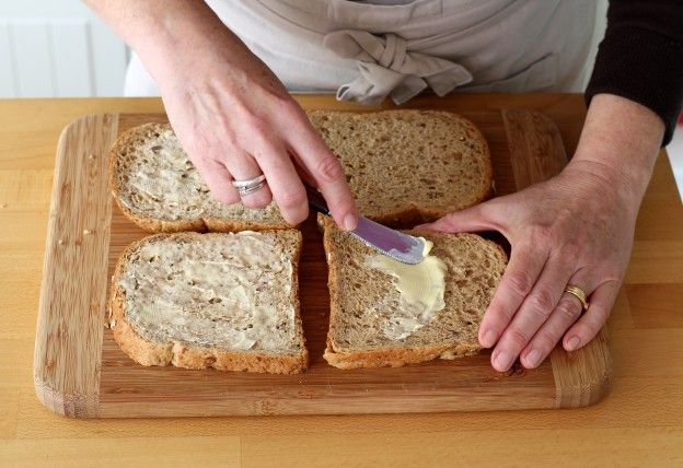 2. On a large piece of plastic wrap, press one slice of bread flat with a rolling pin.