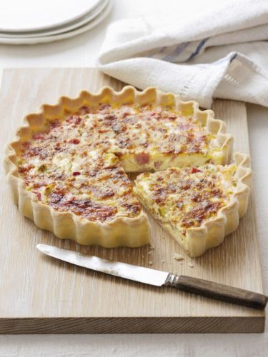 Line a pie dish with shortcrust pastry, prick several times, and top with fried bacon bits. Add your egg, cream and milk mixture (seasoned with a bit of salt and pepper). Sprinkle with 1 cup of the grated cheese of your choice and bake for 35-40 minutes at 350 °F.