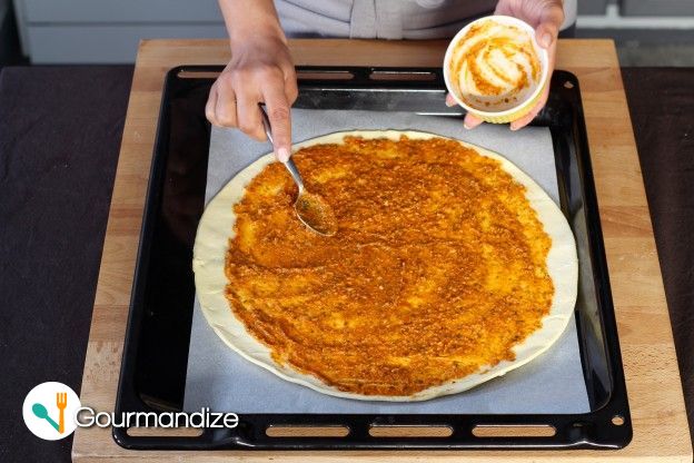 Place 1 sheet of puff pastry on a baking sheet covered with greaseproof paper. Spread the red pesto all over the surface.