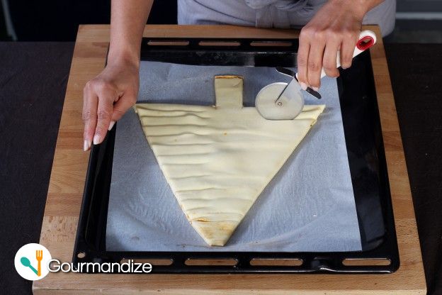 5. Brush the pastry with the egg yolk, then score lightly with a knife.
