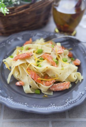 For those who live for tagliatelle and its starchy relatives, here's a really great pasta idea with smoked salmon, lemon zest, cream, spring onions and black pepper. The smoked salmon gets slightly cooked in the process, and you can wilt spinach in at the end, if desired.