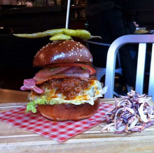 Everyone knows that if it's a Jamie Oliver recipe, it's going to be pretty delicious every single time. His burgers are no exception. 7 ounces of juicy beef slapped onto a puffy sesame bun and topped with tomatoes, guacamole, streaky bacon, chili con carne, Gruyère and lettuce with jalapenos stabbed atop the bun—we're not sure who came up with this creation but it sounds about right! Head to his retro-style diner in London for a taste. Price: Starts at 9.50£ (about $13.60 USD)