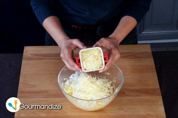 2. In a bowl, combine the potatoes and zucchini. Add the grated cheese, milk, coriander, basil, salt and pepper, and mix thoroughly.