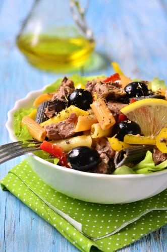 For a colorful salad, mix cooked penne pasta with tuna, tomatoes, salad greens and black olives, then drizzle with a lemon vinaigrette and enjoy.