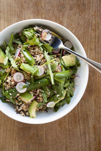 Grains such as bulgur wheat bring color and crunch to your salads, so don't hold back. For this salad, mix sliced radishes, finely chopped zucchini, grains, quinoa, avocado and a bit of arugula.
