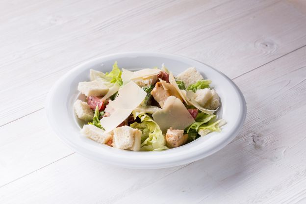 This recipe is made with simple ingredients: croutons, diced chicken, lettuce, tomato and Parmesan shavings The result is a lovely Mediterranean flavor.