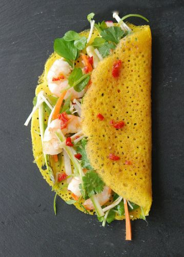 Banh xeo are a type of Vietnamese savory crepe made from rice flour and coconut milk (read: gluten-free). Fill them with shrimp and/or pork, fresh herbs, sugar snap peas, mung bean sprouts, julienned carrots and more, then top it all off with a sweet-spicy Asian-style dressing and enjoy! Get the recipe here.