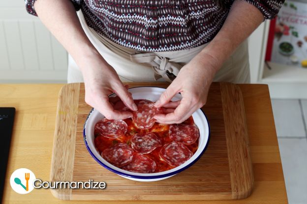 6. Add 1 tbsp pizza sauce, a handful of shredded cured ham