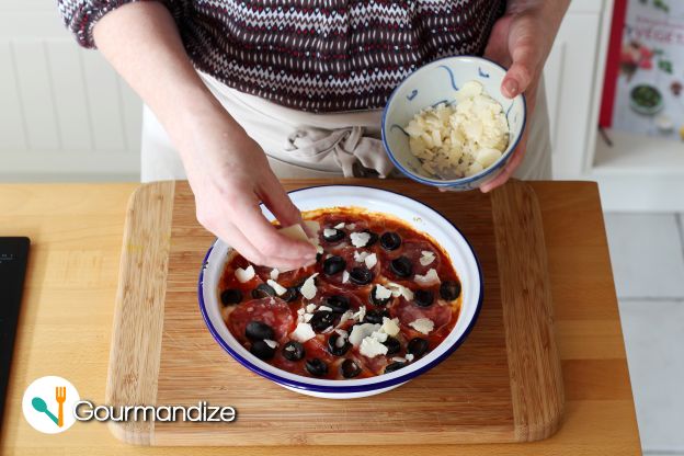 - Add 1 tbsp pizza sauce, a handful of shredded cured ham