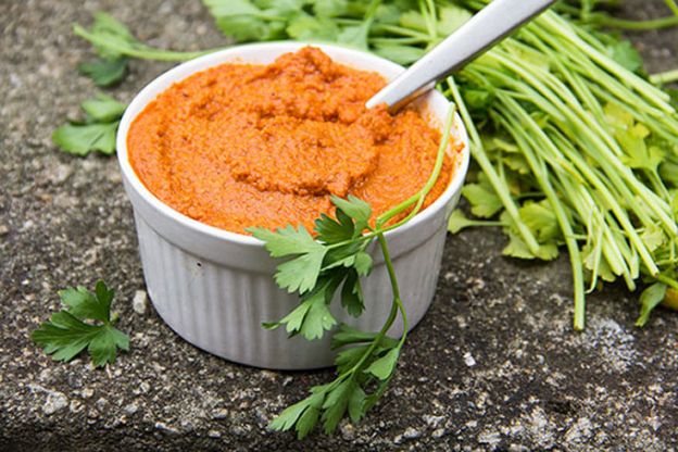 This rich and nutty sauce hails from the Catalonia region of Spain. It goes best with seafood, but you can also serve it with meat, poultry or vegetables or slathered on a slice of fresh toast. This recipe uses stale bread cubes as a thickener and incorporates seared tomatoes and dried ancho chile for a sweet, soft kick.