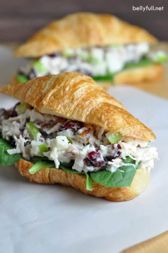 This chicken salad recipe could not be easier to make! It's a mishmash of contrasting textures and flavors: mayo, Greek yogurt, and dijon combined with cranberries, pecans, diced apples, and chicken breast chunks. Serve it on flaky croissants for a truly satisfying picnic lunch!