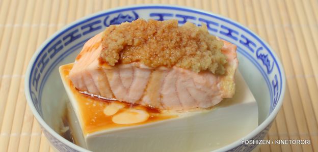 A block of tofu is the pedestal upon which this salmon stands, secure in the knowledge that sometimes, the simplest way is the best.