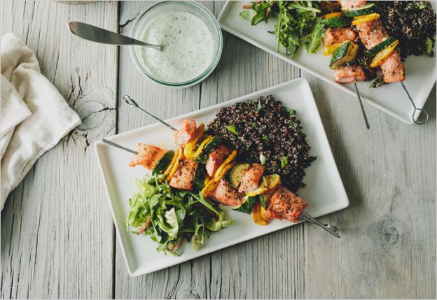 Skewers: like tiny swords that you can imagine driving through your favorite foods, as you thread salmon and vegetable pieces for this tasty, colorful Salmon Skewers with Cucumber Yogurt Sauce recipe.
