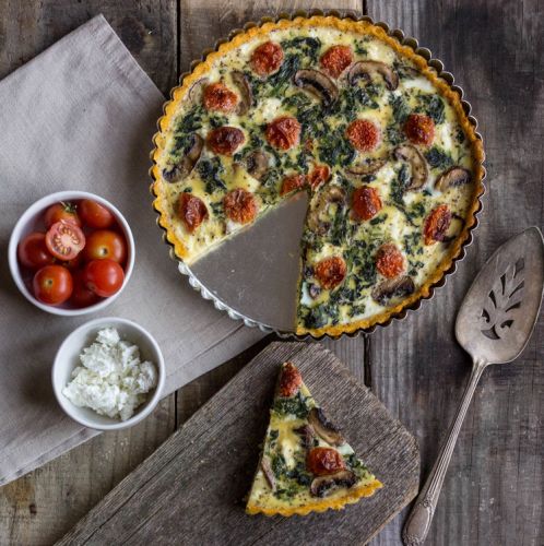 This rather special breakfast tart consists of a baked Parmesan cornmeal crust, filled with a quiche-style mix of egg, mushrooms, cherry tomatoes, and spinach. Pop it into the oven until the center is just set and serve in wedges to your lucky friends and family.