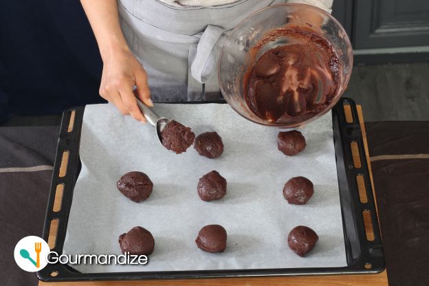 With an ice cream scoop, spoon balls of the dough onto a lined baking sheet, leaving a 2 inch gap between each one.