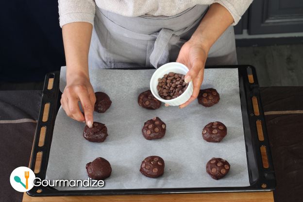 Decorate the cookies with the chocolate chips. Bake for 15 minutes, until they have spread out and the surfaces have cracked (they should still be smooth to touch). Leave them to cool on the baking parchment.